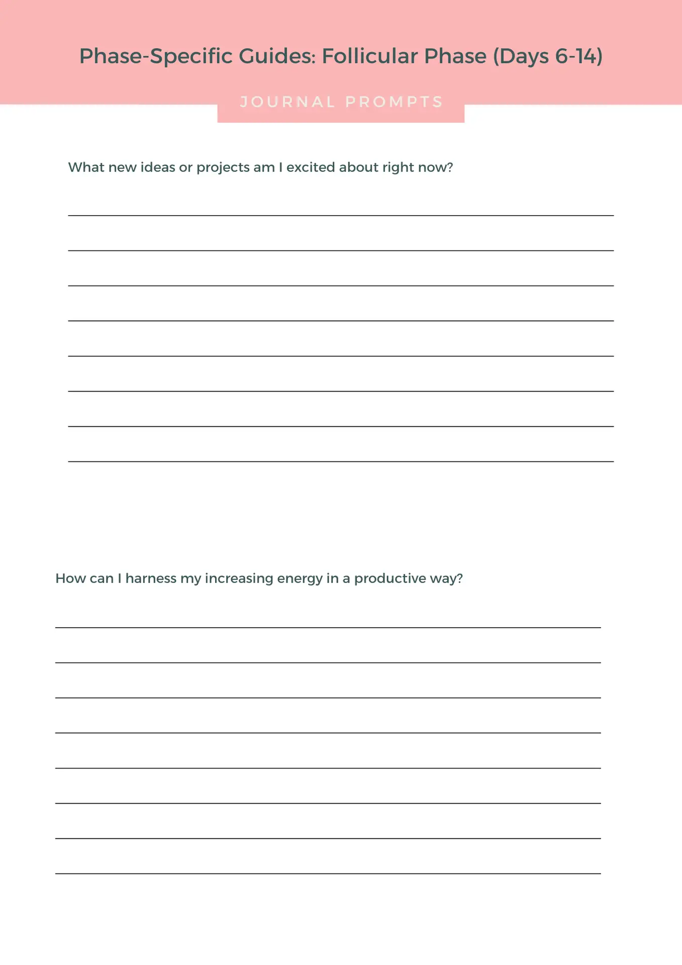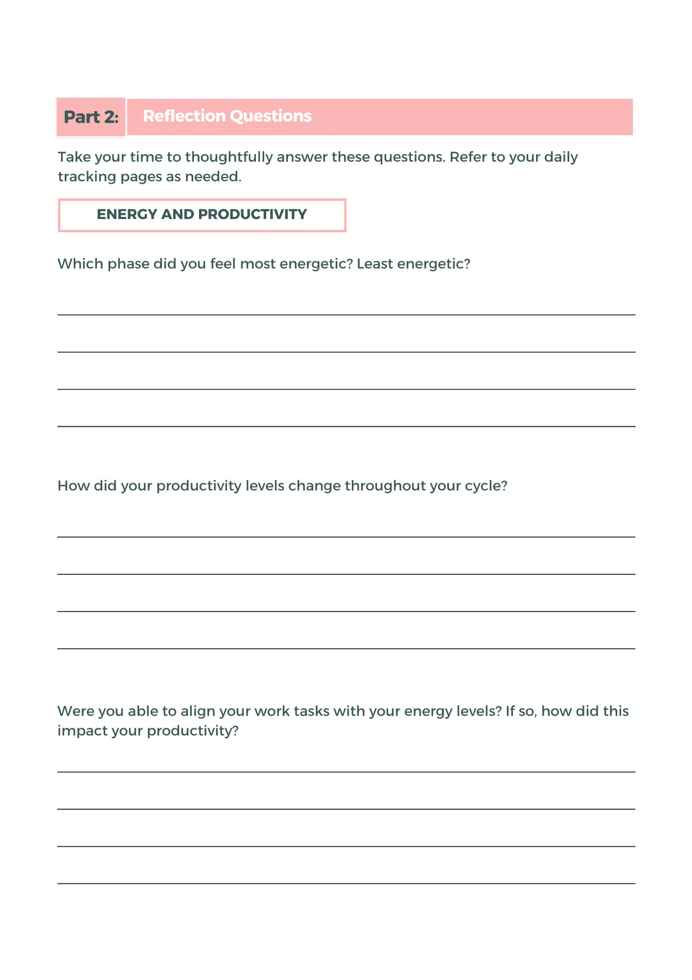 Thoughtful journaling prompts invite reflection on your energy, mood, and symptoms, helping you recognise patterns, build self-awareness, and strengthen self-trust over time. Monthly reflection and planning pages support you to integrate what you’re learning and carry it forward into everyday life.
